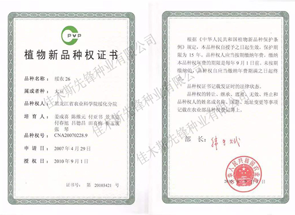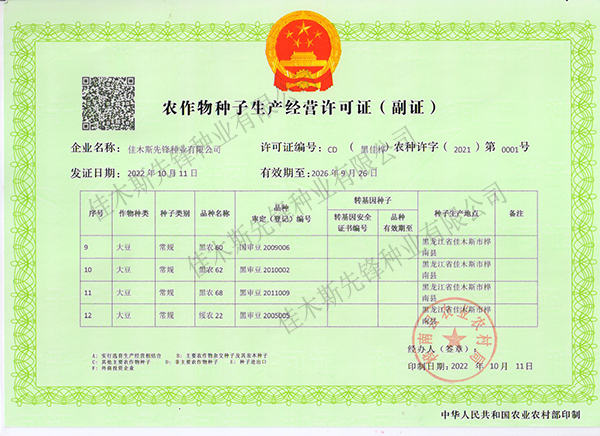 走進(jìn)我們 COME INTO US 您現(xiàn)在的位置:網(wǎng)站首頁 > 走進(jìn)我們 >資質(zhì)榮譽(yù) 公司簡(jiǎn)介 企業(yè)文化 領(lǐng)導(dǎo)致辭 資質(zhì)榮譽(yù) 農(nóng)作物種子生產(chǎn)經(jīng)營(yíng)許可證(副證) 黑農(nóng)48省農(nóng)作物品種合格證書 黑農(nóng)48植物新品種權(quán)證書 綏農(nóng)26植物新品種權(quán)證書 東生51審定證書 綏農(nóng)53審定證書 共30條記錄 當(dāng)前為第2頁/共5頁上一頁12345下一頁